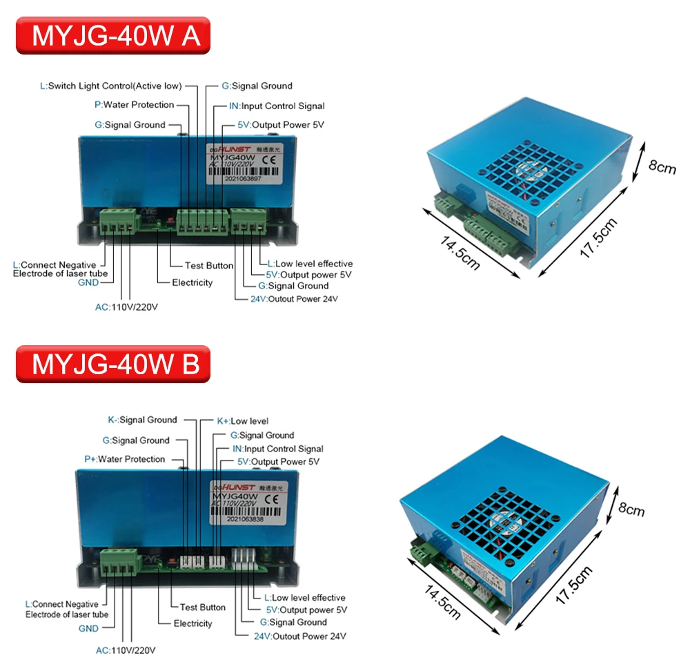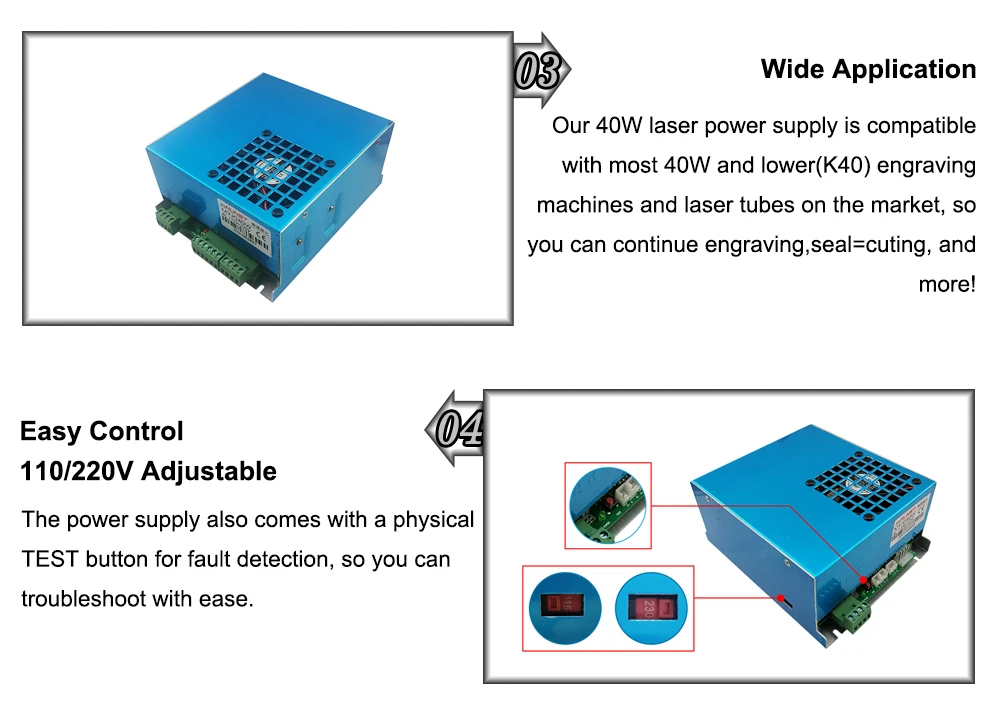 Note: The default voltage of the 40W laser power supply is 220V. If your laser machine voltage is 110V, please adjust this product to 110V. (40W has a voltage adjustment button)