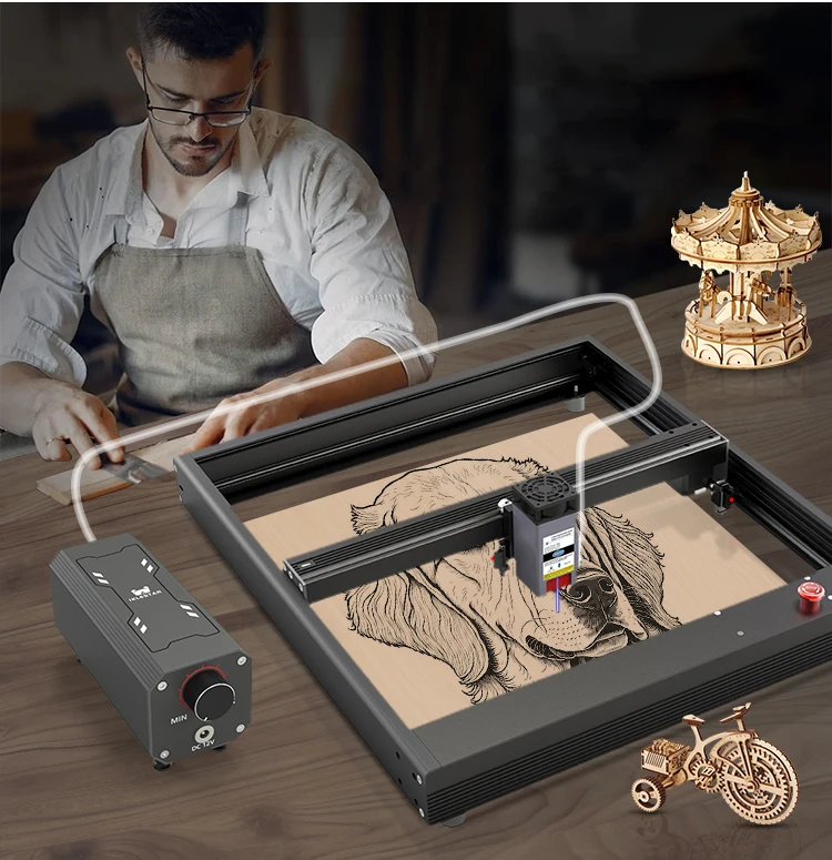 It provides a steady and high-pressure flow of air to blow away the smoke,which is very hot and may make the workpiece turn yellow. Help you get better work. In addition, it can improve the efficiency of laser processing and thus save your time.Hopefully it’ll be a big surprise for you.